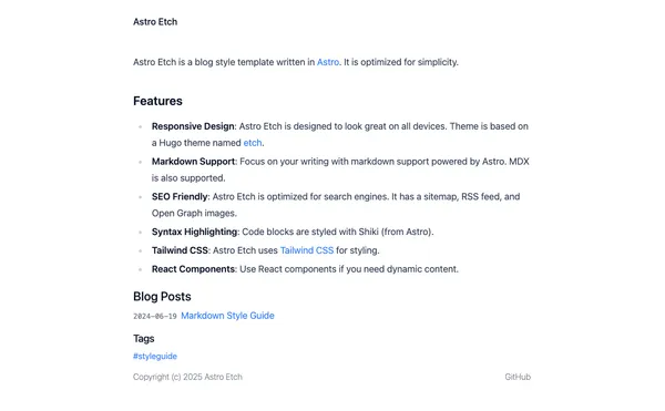 This is a minimal blog system that I use to write. It is based on Astro. Styling is done with Tailwind CSS. The theme was based off of a hugo theme named etch.